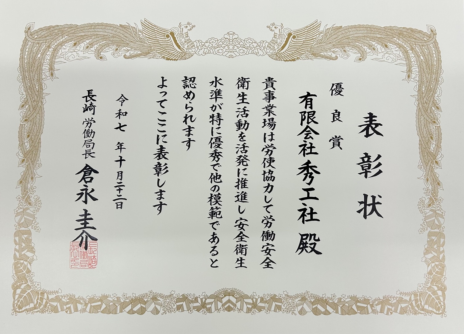 ・長崎県産業安全衛生大会(2025/10/22開催)にて長崎労働局長表彰の優良賞を頂きました。